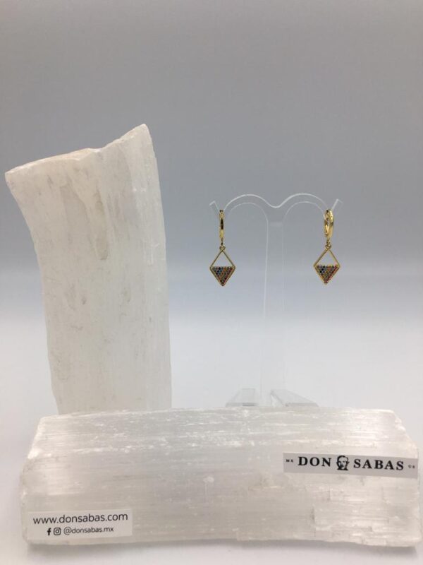 Aretes dorados, rombos con circonias de colores en oro laminado 18K.