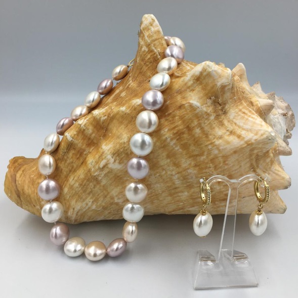 Collar de madre perla con nudo hilo de seda, cadena y broche de chapa de oro 14K. (incluye aretes)