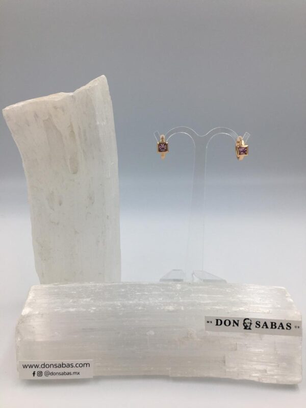 Aretes dorados, arracada con cuadro circonia rosa en oro laminado 18K.