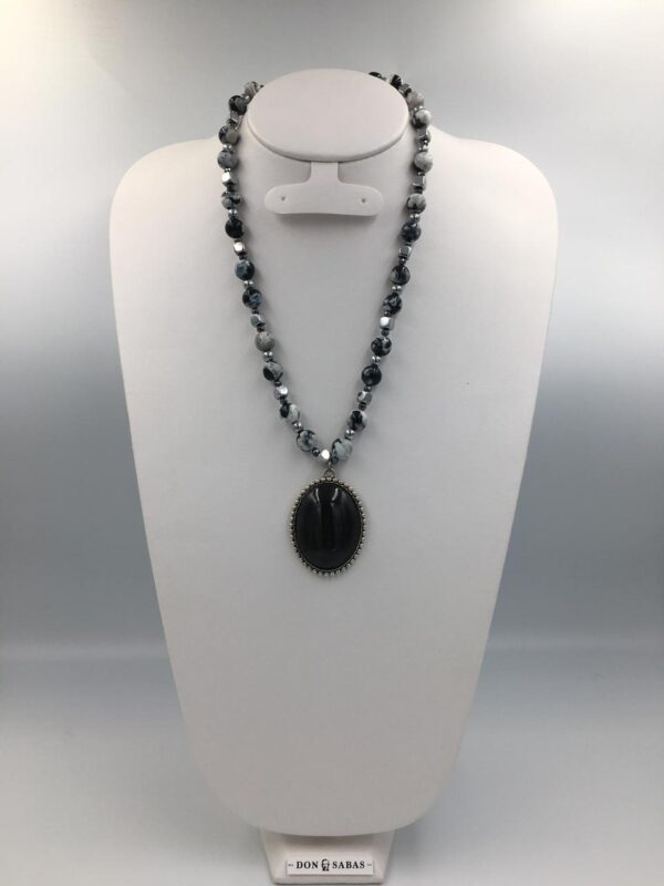 Collar plateado, cuentas de onix, cubos de hematita y dije de agata café con broche chapa de plata.
