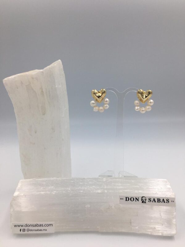 Aretes dorados, corazón con perlas de río en chapa de oro 14K.