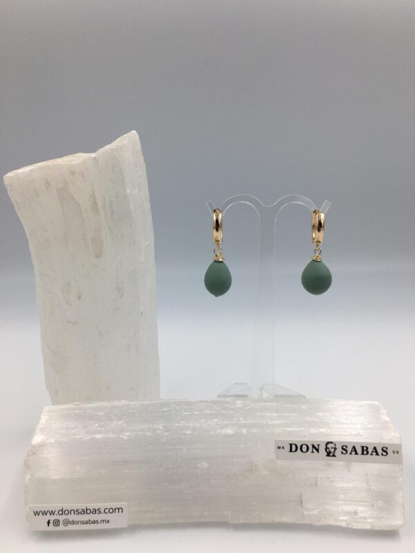 Aretes dorados, gota cristal verde mate con chapa de oro 14K.