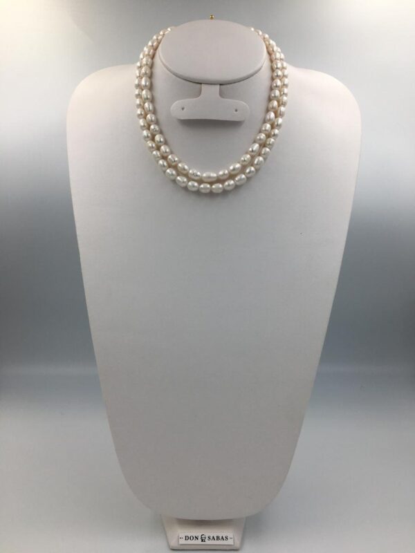 Collar dorado, doble de perlas de río con broche chapa de oro 14K.