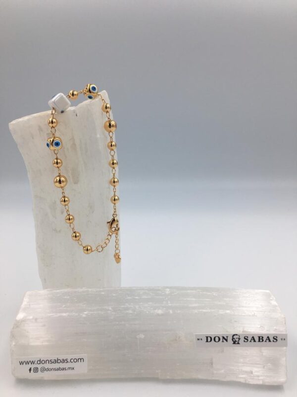 Pulsera bolitas doradas con ojo cubo blanco de oro laminado 18K.