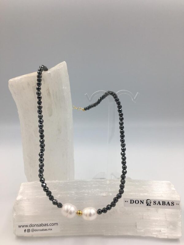 Collar de Hematita facetada con perla de río 10/11mm, broche chapa de oro.