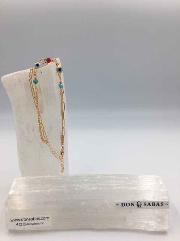 Pulsera doble, cadena con ojos celestes de oro laminado 18K.