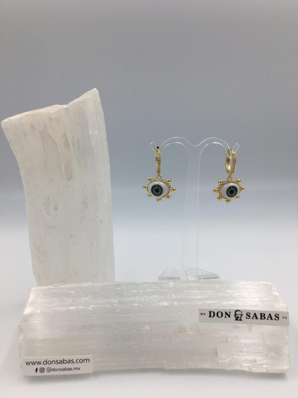 Aretes dorados, arracadas con ojo de color en oro laminado 18K.