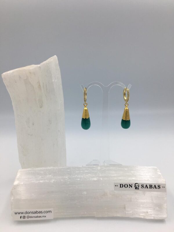Aretes dorados, gota de cuarzo verde con micropave y chapa de oro 14K.