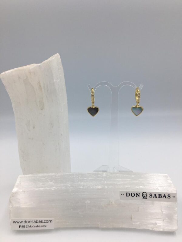 Aretes dorados, corazón lamina madre perla tornasol con micropave y chapa de oro 14K.