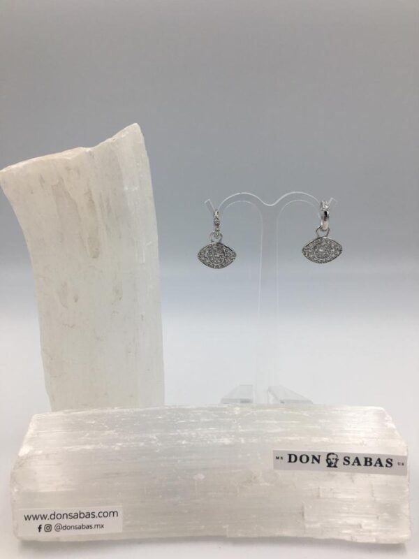 Aretes plateados, arracadas dos en uno, ojo con circonias, en chapa de rodio.