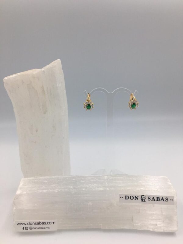 Aretes dorados, flor circonias con cristal verde en oro laminado 18K.