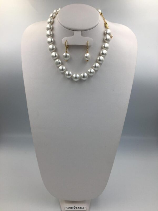 Collar y aretes dorados, madre perla color blanca, con nudo, broche chapa de oro y extensión.