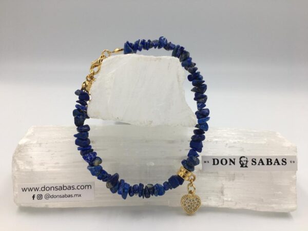 Pulsera chips de lapislázuli con dije corazón de chapa de oro.