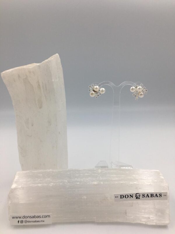 Aretes plateados, arreglo de tres perlas naturales con circonias en rodio.