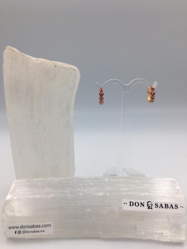 Aretes dorados, arracadas ojitos rojos en oro laminado 18K.