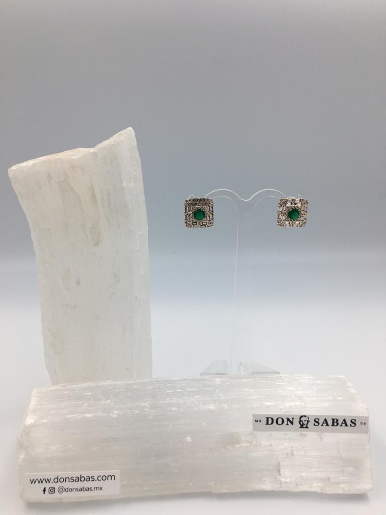 Aretes hipoalergénicos color dorado, diseño cuadro de circonias blancas con circonia verde en oro laminado, tamaño mediano.