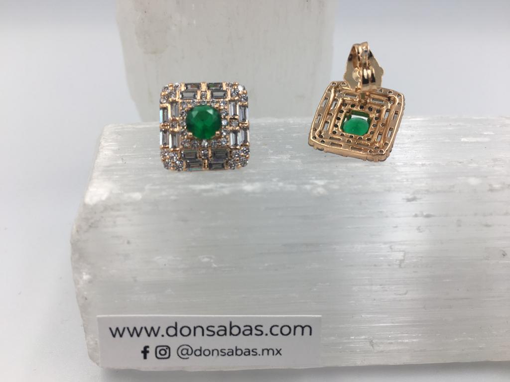 Aretes dorados cuadro de circonias blancas con circonia verde en oro laminado 18K.