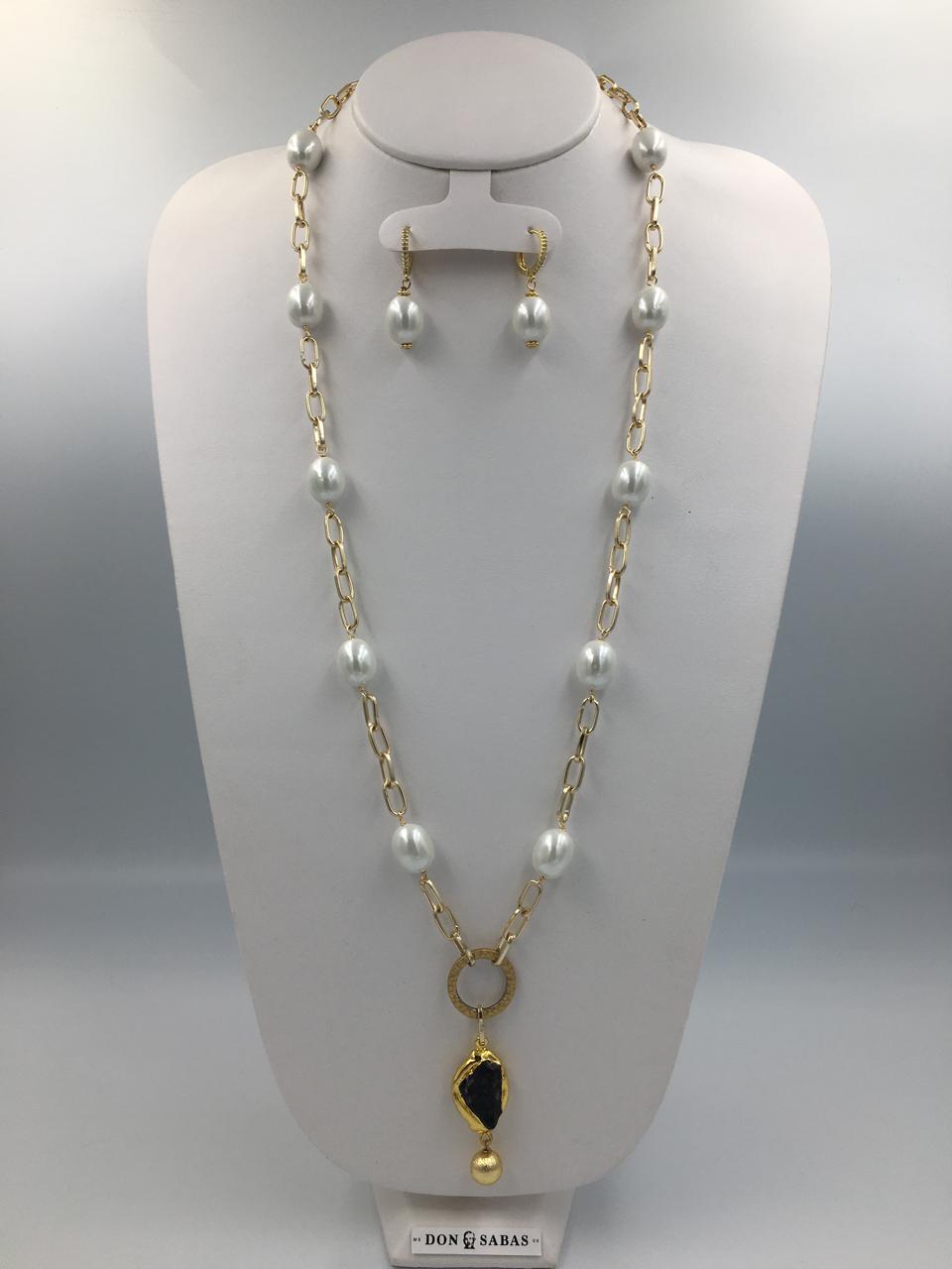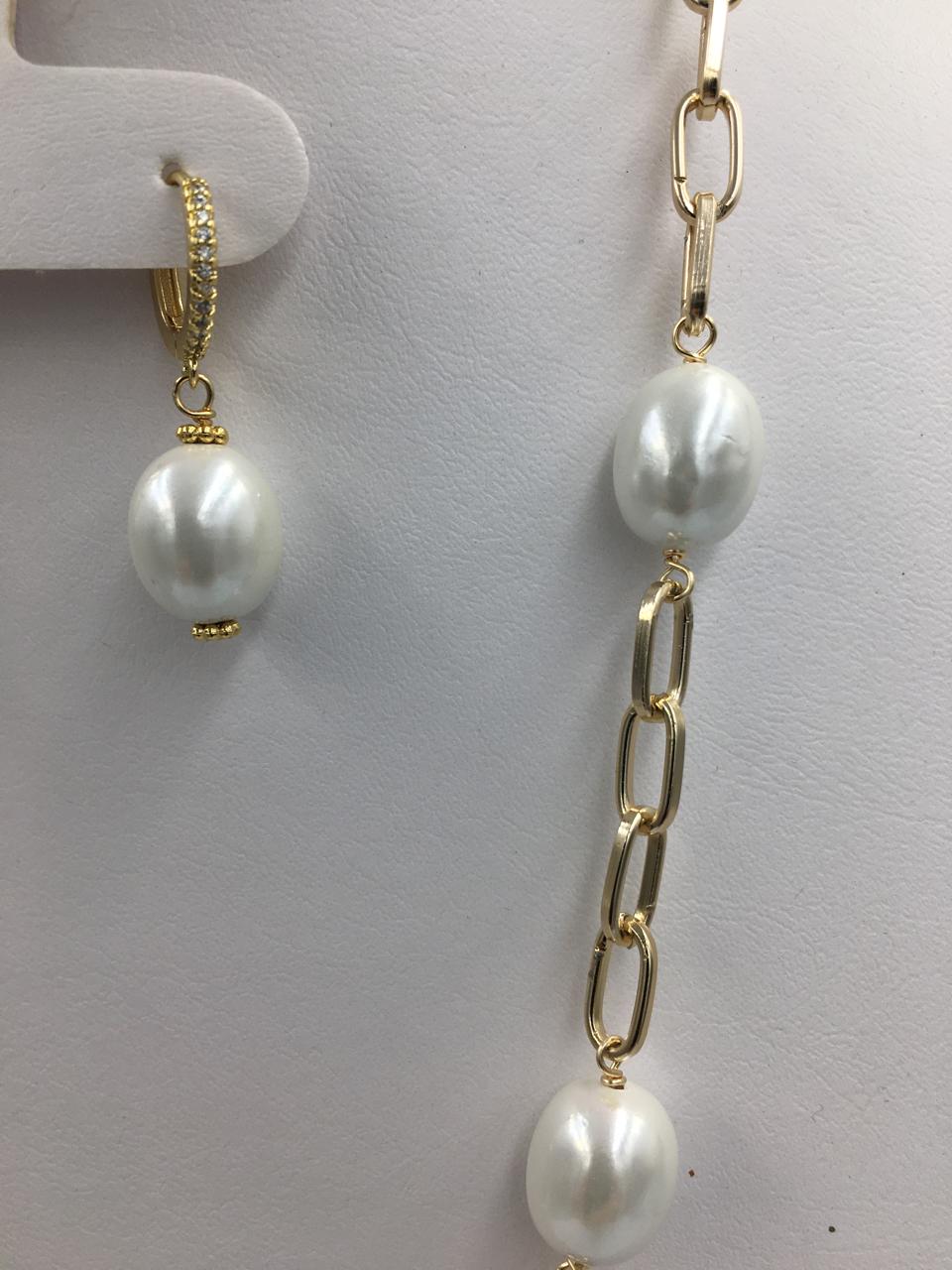 Collar y aretes dorados, cadena aleación aluminio con 10 perlas barril color blanco y dije amatista.